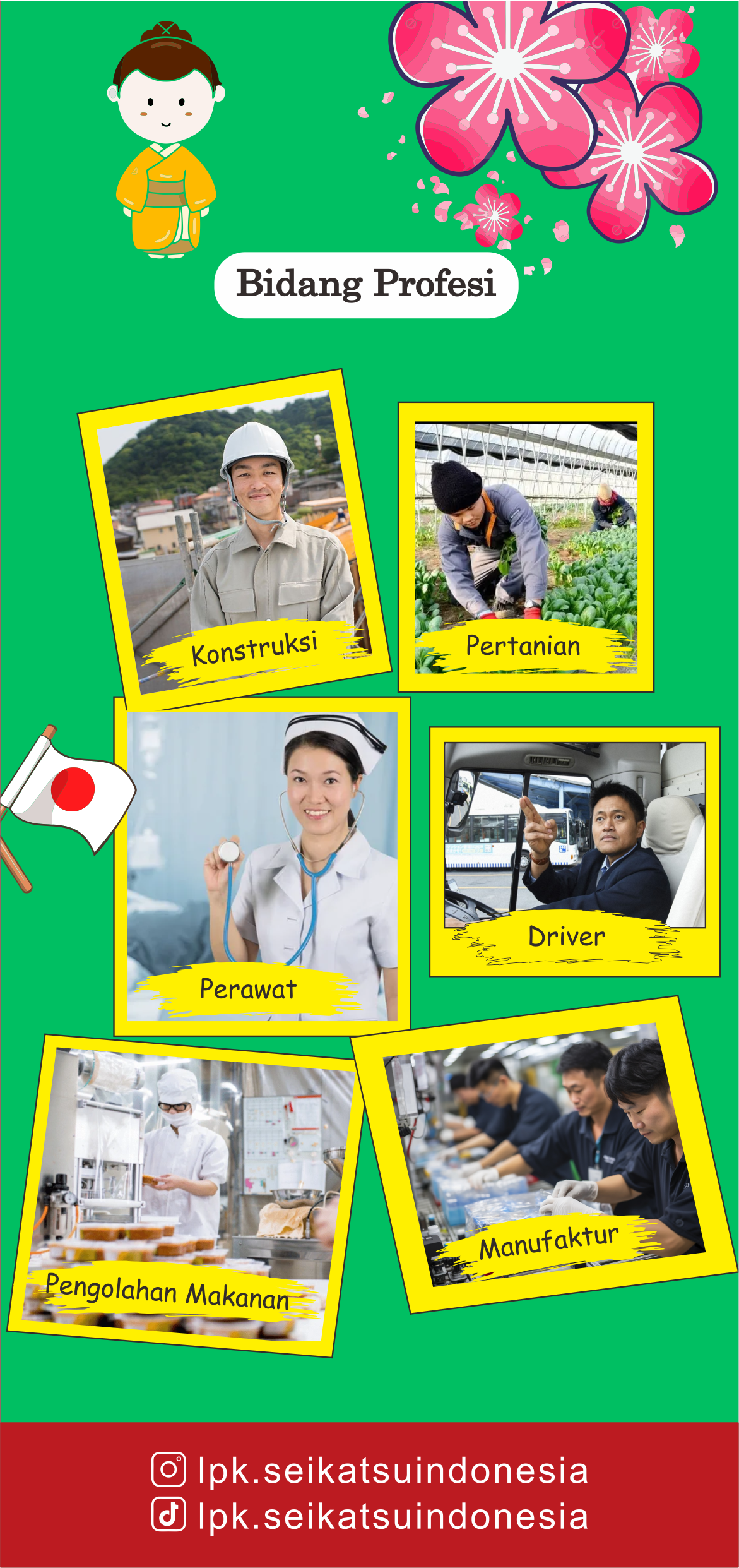 Sektor unggulan: Keperawatan (Kaigo), Pengolahan Makanan, Perhotelan, dll.